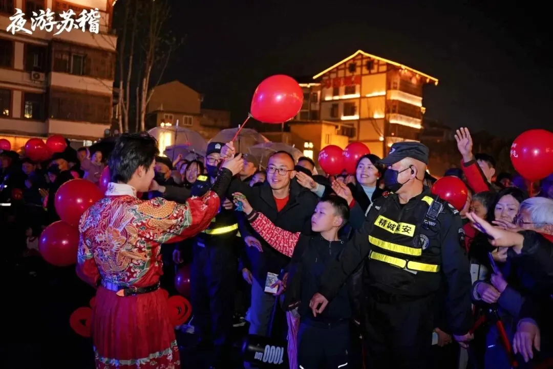 演艺舞台同样精彩纷呈。茹公桥畔,鱼灯巡游与女子群舞唯美上演,灯火摇曳间尽显江南水乡温婉神韵;古戏台上,川剧绝活、国风舞蹈轮番登场,融合现代元素的川剧变脸表演更是赢得年轻观众喝彩。遍布古镇的互动环节更添乐趣,游园打卡、美食闯关等活动吸引众多游客参与,通过游戏赢取的 “乐游币” 可兑换礼品或消费抵扣。跷脚牛肉、甜皮鸭等特色美食香气四溢,让游客在赏景看戏之余尽享舌尖年味。“很久没大年初一晚上出来了,今晚氛围特别好、人特别多。” 市民童美英笑着说,活动中的鱼灯巡游还吸引了外国游客参与,用中文互道“春节愉快”的场景格外温馨。