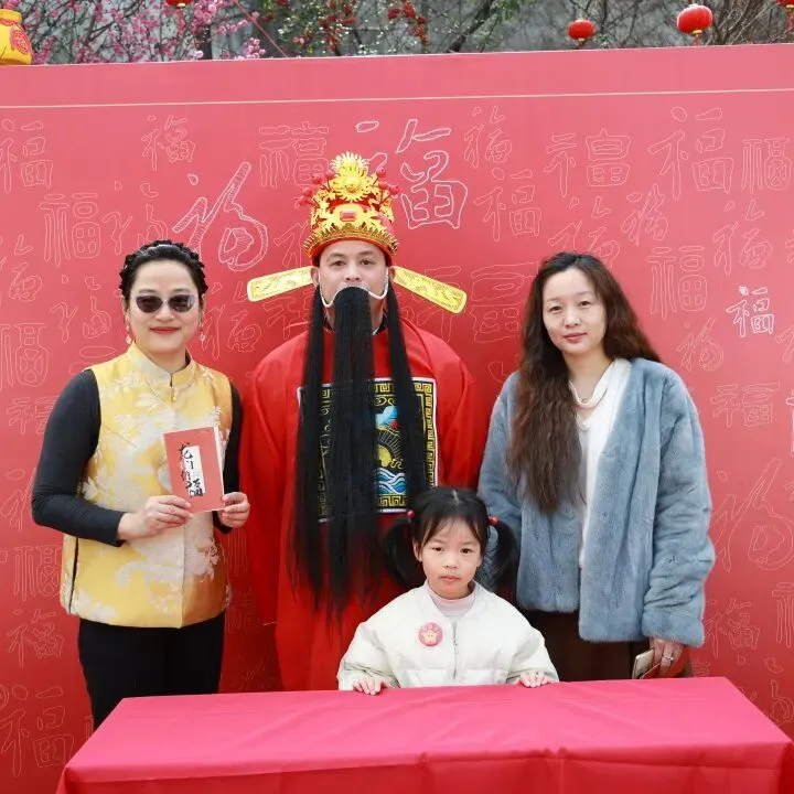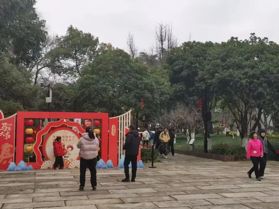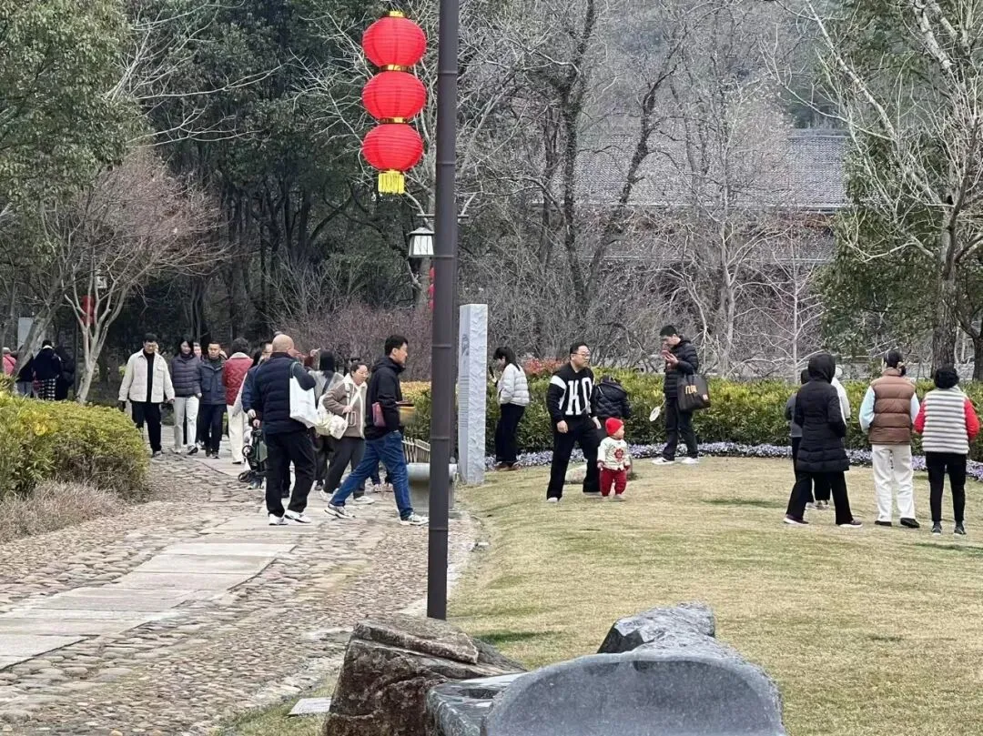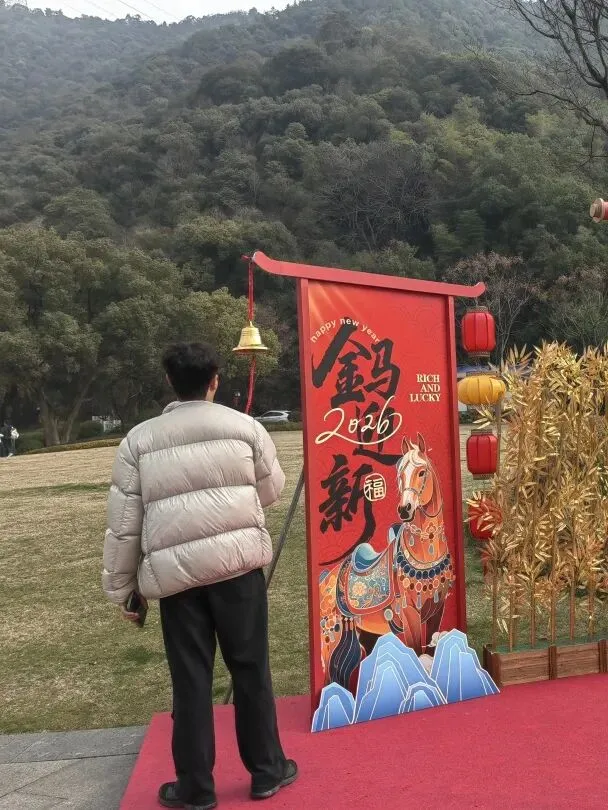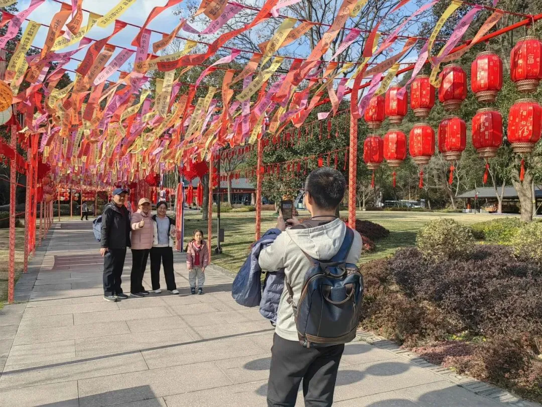 鹳山景区主打“错峰慢游”,为游客提供一种避开喧嚣、享受团圆的别样年味。火红的“马年大吉”与高悬的红灯笼相映成趣,往来游客在此驻足留影,定格下新春的第一张团圆合影。