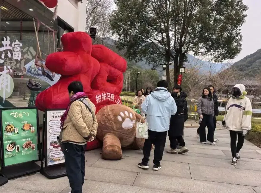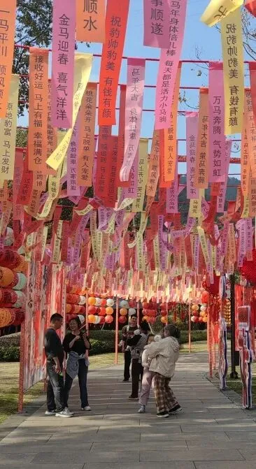 景区以“富春山居图”为底色,通过“福马”打卡点、“马年大吉”舞台、“隐逸之道”彩绸长廊、小洞天“竹韵雅境”及富春茶栖等多个场景,为游客营造了一个充满诗意与欢乐的过年氛围。