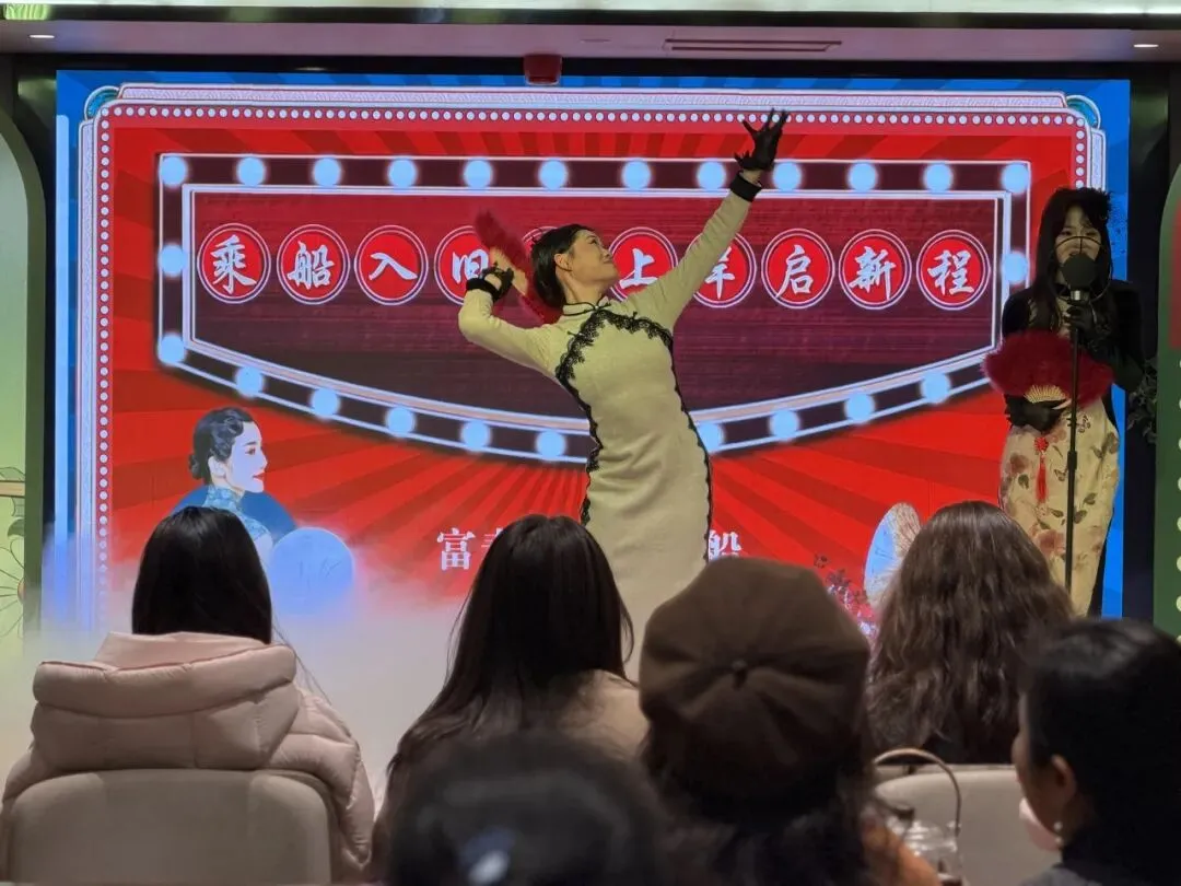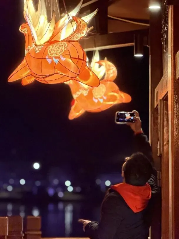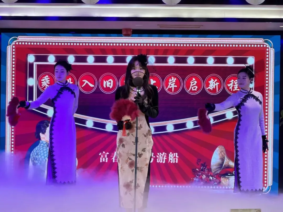 游船一楼还原老上海百乐门场景,上演《咏春》等经典曲目的歌舞表演。二楼特设互动打卡区,结合马年主题布置飞马灯组,寓意“一马当先”,吸引游客纷纷合影。