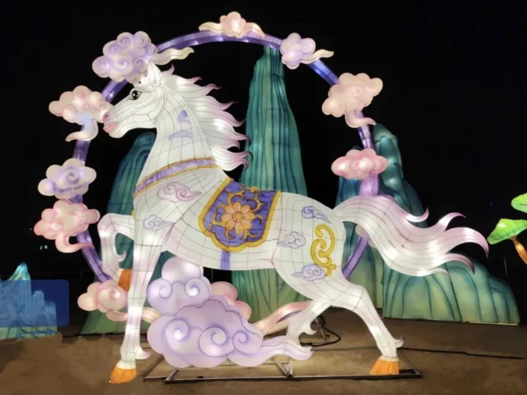 在阳陂湖湿地南景墙旁,一匹凌空奔腾的“骏马”灯组成为最受游客欢迎的打卡点。白紫渐变的骏马吸引许多家庭与年轻人驻足观赏。
