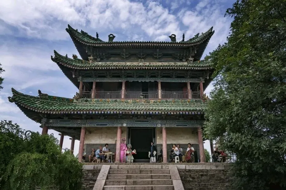我们驱车来到大寨子村,结果吃了闭门羹:‘’文报单位,谢绝参观‘’。隔着门缝看着雕梁画栋的建筑,据记载,1934年经梁思成考察鉴定,确认其沿用宋代营造法式。楼体分三层,一二层设回廊,乐庭原为奏乐祈神场所,现存塔形收分结构与宋代木构特征。