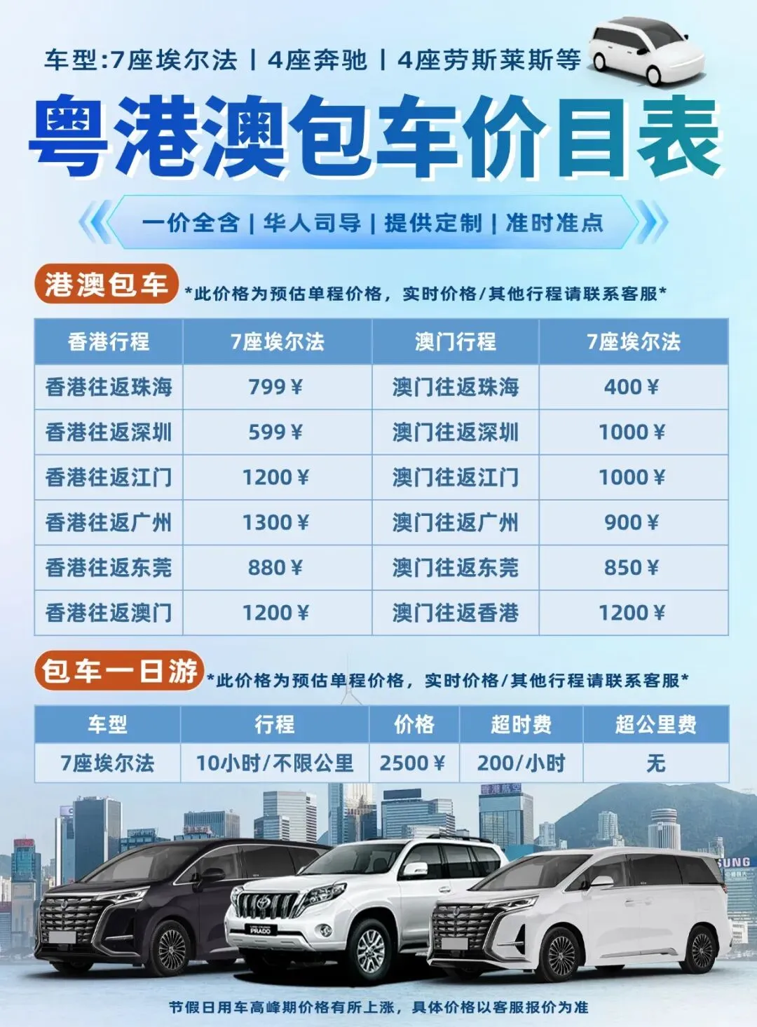 拒绝行业隐形消费、临时加价、节假日溢价等乱象,坚守透明定价原则,全程一价全包,价格清晰公开、一目了然。无夜间服务费、无节假日溢价、无临时收费,报价涵盖门到门接送、通关协助、全程驾驶服务、车载配置使用等所有项目,出行前即可明确全部预算,心中有数;出行中无需承担任何额外费用,轻松无忧。用实在的价格,提供高品质的臻享服务,让每一分花费,都物超所值。