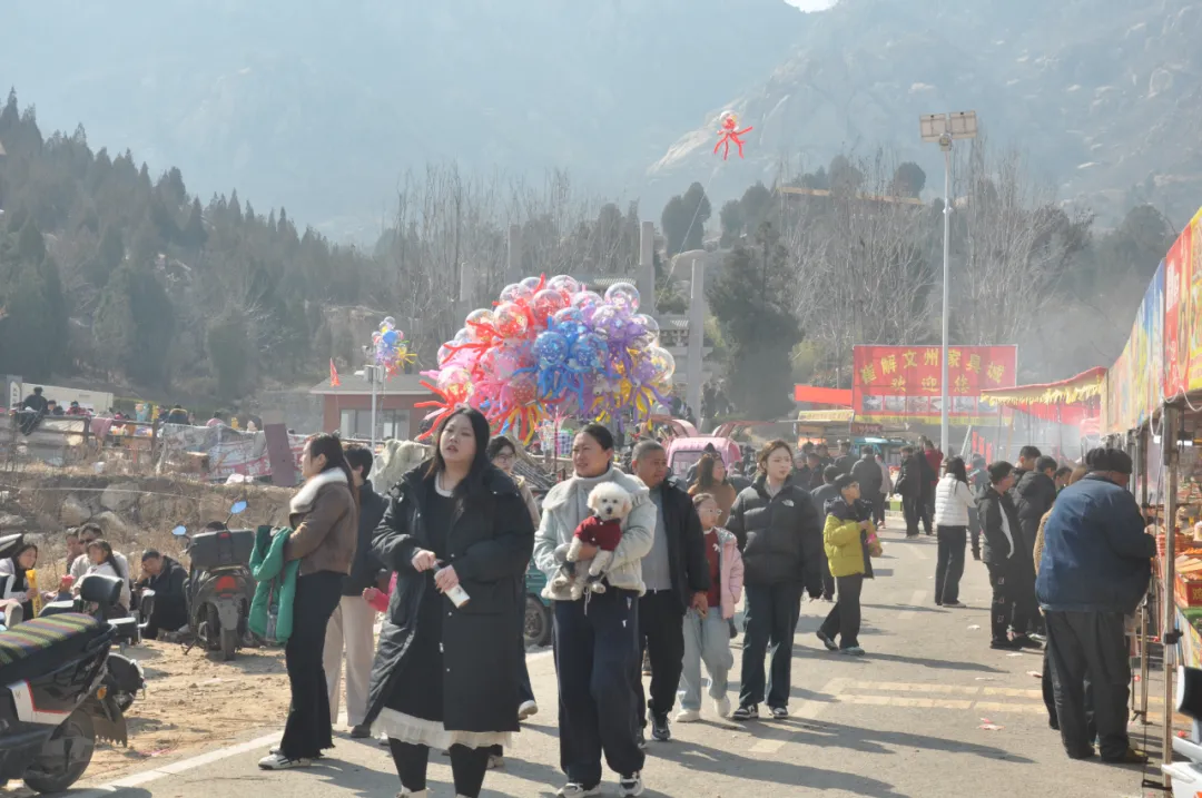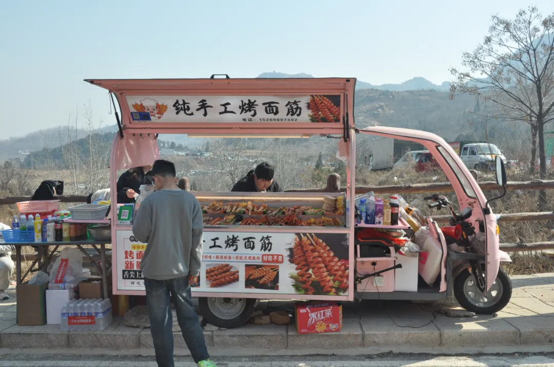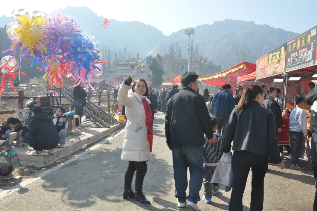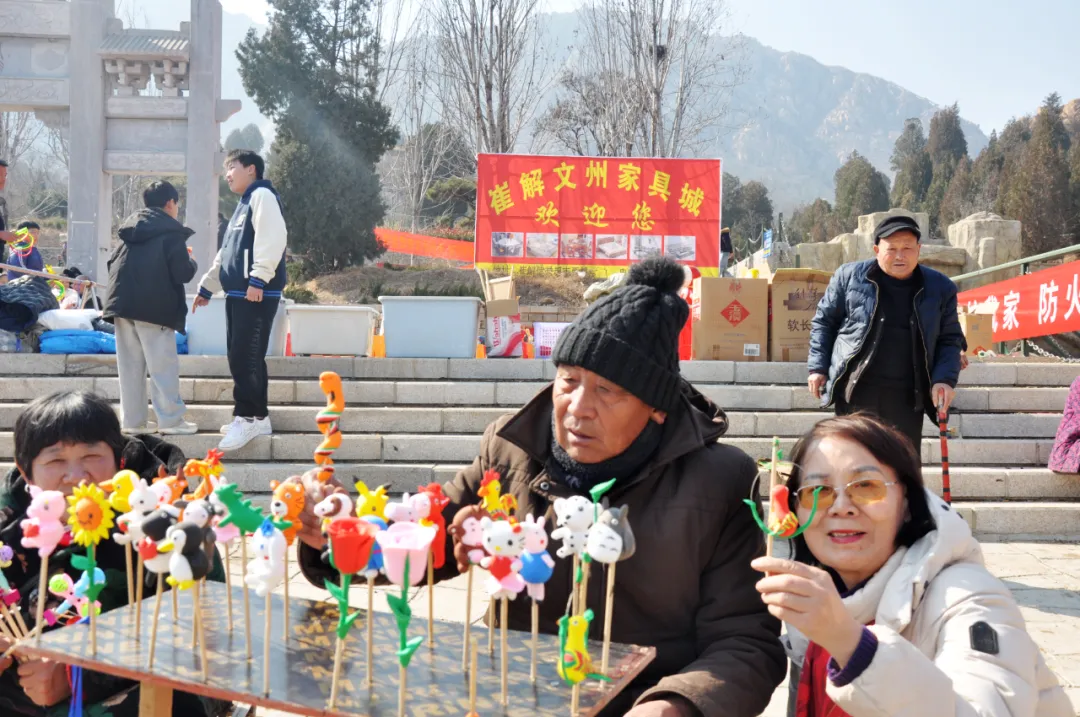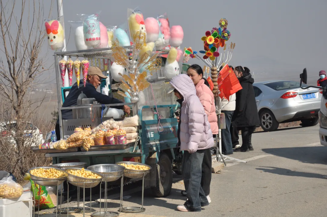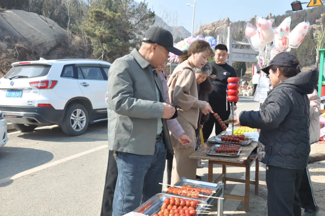 风仙山脚下,年味与烟火气交织升腾。蜿蜒的山道上,游客们扶老携幼,步履轻盈,或登高望远饱览春日山色,或驻足林间感受天然氧吧的清新。景区入口的小吃市集里,各类特色美食琳琅满目,香气四溢。新疆大烤串色渍金黄外皮酥脆,内里鲜香;软糯香甜的宁阳凤仙山板栗热气,裹满了新春的甜蜜;还有山野菜,手工花生糖等乡土风味,每一口都是熟悉的家乡味道。摊主们的吆喝声、游客的欢笑声、食物的滋滋声,汇成一曲热闹的春日交响曲,让人流连忘返。