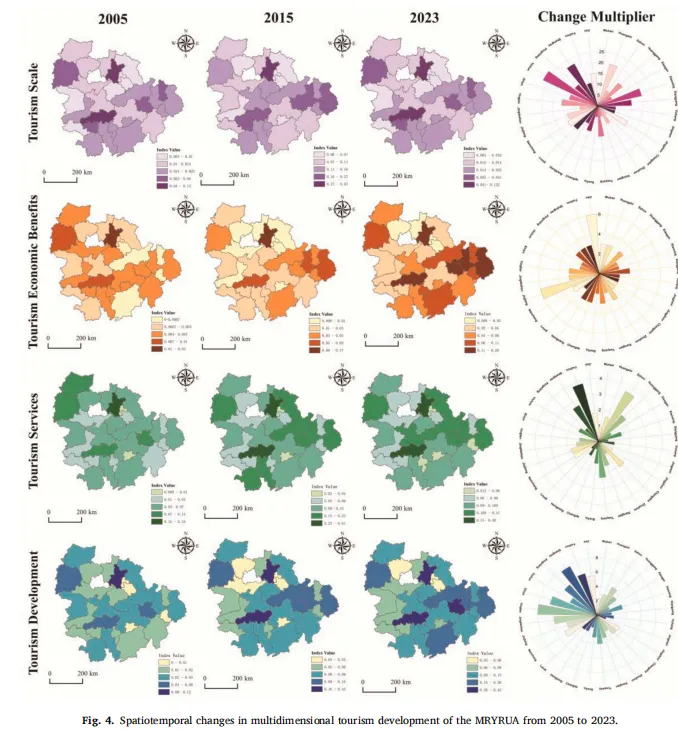 如图4所示,2005年、2015年和2023年MRYRUA的TD呈现出显著的时空异质性和清晰的动态演化特征。从时间维度看,TD、旅游规模、旅游服务和旅游经济效益这四个指标均呈现整体上升趋势,但其增长速度和波动程度存在显著差异。TD指标从2005年的0.03增长至2023年的0.14,尤其在2020年后展现出较强的韧性。旅游规模指标增长最为显著,从0.02上升至0.25,增长了12.5倍。旅游服务指标从0.06稳步增长至0.15,增长相对平稳。相比之下,旅游经济效益指标增长较为缓慢且波动性更大,从接近零增长至约0.07,这表明需要提升旅游产业的经济转化效率。从空间维度看,旅游规模指标呈现出明显的核心-边缘结构,高值区集中在武汉、长沙、南昌等省会城市。这些高值区到2015年显著扩张,到2023年趋于稳定,约75%的城市实现了大幅增长。旅游经济效益指标呈现出东南向西北的梯度特征。2005年,区域东部和南部城市普遍优于西北部城市。到2015年,高值区进一步向东扩展,至2023年,南昌、武汉、长沙等城市达到了0.16至0.27的最高值区间。同时,旅游服务指标呈现出相对均衡的空间分布和明显的层级分异特征,中心城市始终维持较高水平。大多数城市经历了1至2倍的中等增长,少数城市实现了3至4倍的增长倍数。总体而言,TD指标呈现出多中心、层级化的空间格局,从最初集中于核心城市,逐步演进形成次级中心。到2023年,MRYRUA内大多数城市已进入快速增长阶段,形成了以核心-边缘结构为特征的显著高值簇。