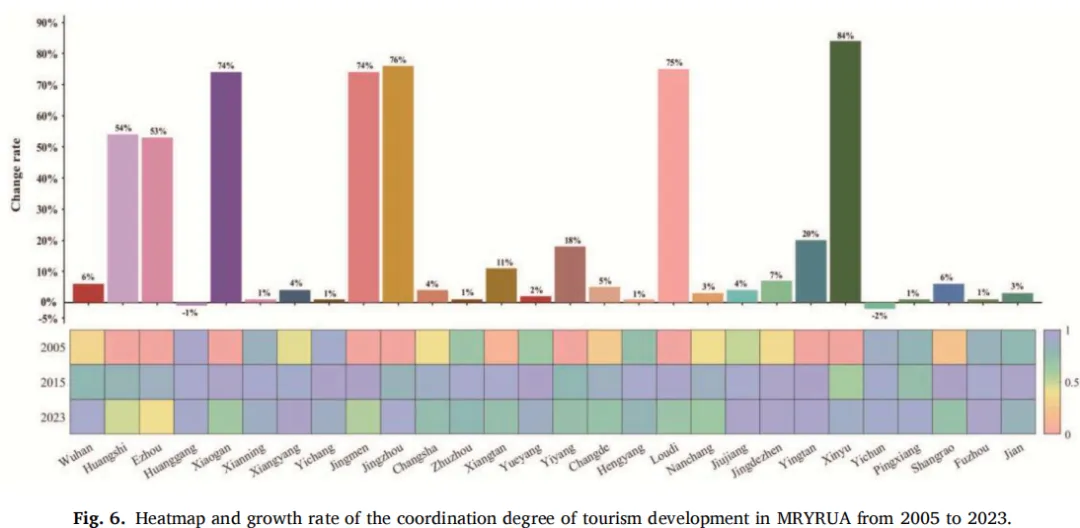 如图5和图6所示,MRYRUA的TD协调度呈现出清晰的时空演化格局。从2005年到2023年,区域协调度经历了三个distinct阶段,即低水平阶段、快速提升阶段和稳定优化阶段。在此期间,空间格局从散点分布演变为集聚块状结构。区域平均协调度从2005年的0.37上升至2015年的峰值0.90,随后在2023年略微下降至0.81,但整体仍保持在较高水平。这种时间演变密切反映在协调度的空间分布上。高协调区域经历了点-轴-面的扩散过程。2005年,空间格局以黄冈、宜昌、宜春等城市为代表的散点状高协调点为主。到2015年,形成了连接荆门、岳阳、上饶、鹰潭等城市的带状结构。到2023年,形成了以武汉、荆州、襄阳、九江、景德镇、抚州为核心城市的连片集群格局。城市间协调度增长率存在显著差异。襄阳、荆门、荆州、娄底、新余等城市的增幅超过70%,黄石和鄂州的增幅也超过45%,增长显著。相比之下,黄冈和宜春则略有下降。2015年是区域协调发展的关键转折点。2005年至2015年期间,大多数城市协调度快速提升,而2015年至2023年期间,增速普遍放缓,部分城市协调水平下降。这一模式表明,MRYRUA的TD已进入一个以精细化、优化为特征,而非快速扩张的阶段。总体而言,这些结果为理解TD协调度的时空演化提供了重要见解,并强调了需要持续的政策努力以加强区域一体化,促进更均衡、高质量的发展。