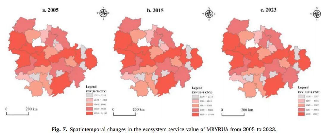 2005年至2023年,MRYRUA的ESV呈现持续下降趋势,并伴有显著的空间异质性(图7)。在过去二十年中,研究区的ESV总量下降了3.16%。生态资源丰富的西部和中部地区始终保持较高的ESV,而东部地区则持续处于较低水平。从货币价值来看,ESV总量从2005年的约190432.2亿元下降至2015年的187503.9亿元,进一步下降至2023年的184410.7亿元,累计减少6021.5亿元。这种时间上的下降伴随着明显的空间分异。总体而言,MRYRUA的ESV空间格局可概括为西高东低、中部相对集聚。宜昌、荆州等西部城市,连同岳阳、九江等中部城市,保持着相对较高的ESV水平。相比之下,上饶、景德镇、鹰潭等东部城市,以及武汉周边的北部城市,ESV值持续较低。2005年至2023年间,尽管总体空间格局相对稳定,但大多数城市经历了不同程度的ESV下降,且原本ESV水平较高的地区下降更为明显。岳阳和上饶的降幅最为显著,分别下降了17.48%和12.68%。其他ESV损失显著的城市包括九江、益阳和荆门。相比之下,有七个城市在研究期间ESV呈现正向变化。其中,常德、孝感和咸宁增幅最为明显,黄冈、襄阳、株洲和随州也录得ESV增长,但增速相对温和。总体而言,这些结果凸显了区域ESV持续下降以及强烈的空间分异,强调了识别关键驱动因素、推行能更好平衡生态保护与经济增长的可持续发展战略在MRYRUA的紧迫性。