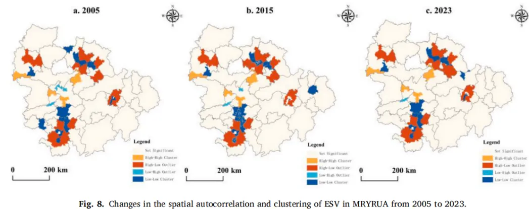 图8展示了MRYRUA的ESV空间自相关与集聚特征的时序演变。总体而言,研究期间区域西部和中部的高值区始终突出,但空间集聚的强度随时间逐渐减弱。从2005年到2023年,观察到ESV空间集聚模式的若干显著变化。高-高集聚区的空间范围保持相对稳定,而低-低集聚区则表现出更明显的空间调整。具体而言,低-低集聚区在区域北部和西南部收缩,但在东部地区扩张。此外,低-高集聚区在岳阳、九江和宜昌等城市有所增加,而在南昌略有减少。同时,高-低集聚区在黄石显著扩张。2005年,高-高集聚区主要集中在岳阳-益阳走廊以及宜昌-咸宁地区,表明这些区域及其周边地区的ESV持续处于高水平。低-低集聚区主要分布在武汉城市圈外围、长株潭城市群核心区以及赣江中游地区,反映了这些区域ESV持续偏低。同时,宜昌、衡阳、武冈、湘潭等城市呈现出高-低集聚模式,形成孤立的高值区,而益阳和岳阳的部分地区则呈现低-高集聚,表明在高值环绕中存在局部的低值区。到2015年,低-低集聚区在南昌和娄底收缩,但在景德镇扩张。到2023年,低-低集聚区在九江和南昌进一步增加,而在景德镇则有所减少。与此同时,高-低和低-高集聚模式的数量减少,表明区域ESV空间分布趋于均质化。总体而言,这些结果突显了ESV空间集聚模式的动态演化及其对区域生态与城市规划的启示。应对空间均质化带来的挑战,同时保护生态价值,对于指导MRYRUA的可持续发展至关重要。