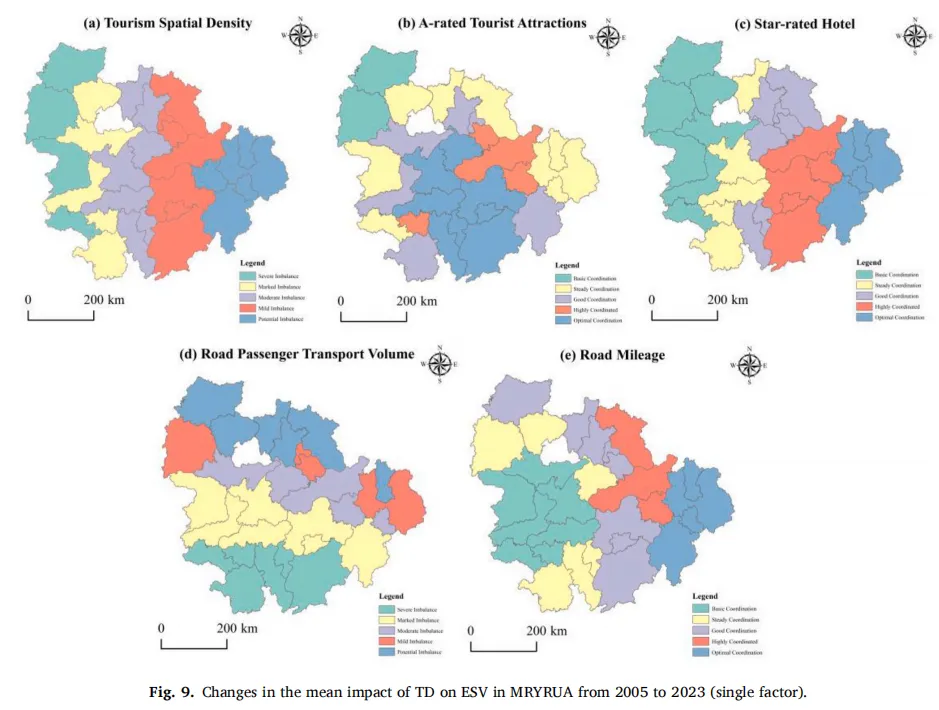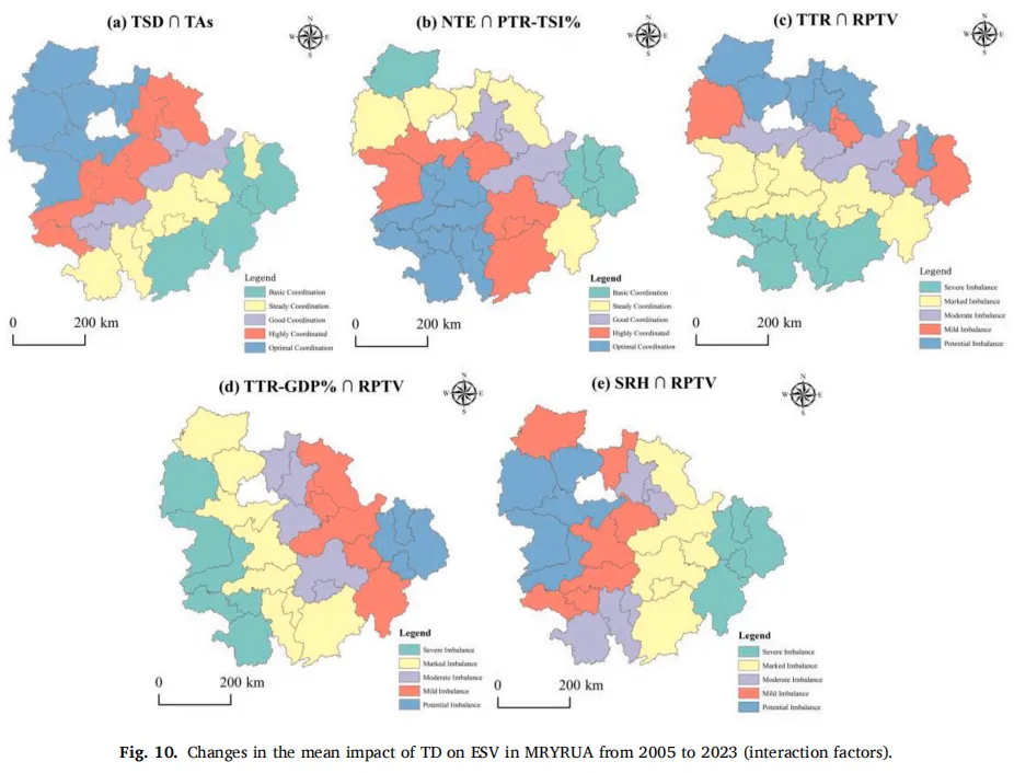 图9、图10展示了2005年至2023年期间TD影响MRYRUA的ESV的多维方式。总体而言,基础设施相关因素、接待能力以及关键的经济和流动性关联(如TTR与RPTV的交互作用、NTE与PTR-TSI%的交互作用)对ESV产生显著的正向影响。相比之下,TSD、RPTV以及TTR-GDP%与RPTV的交互作用对ESV产生不利影响。从空间角度看,TSD、SRH数量和RM呈现出西向东递增的梯度,而RPTV则由南向北递增。AATA数量的空间分布呈现出明显的中部集聚模式。此外,交互效应显示出显著的空间分异。TSD与TA数量之间的交互作用,以及SRH与RPV之间的交互作用,从东南向西北方向增强。涉及TTR的交互效应从西南向东逐步增强。NTE与PTR-TSI%之间的交互作用呈现出由东北向西南扩散的包围式格局。