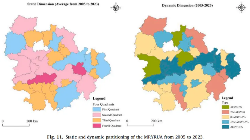 图11展示了从静态和动态两个维度对MRYRUA进行的分区特征。从静态维度看,识别出四种类型区。第一,生态优先型(II)主要分布在区域西部和中部。这些地区以高ESV但旅游业相对欠发达为特征,因此是重要的生态功能区。第二,协调发展型(I)主要出现在宜昌、吉安、武汉、九江、上饶等城市,这些地区旅游发展与生态系统服务相对平衡。第三,旅游主导型(IV)主要限于长沙和南昌,表现为旅游业发展相对领先但ESV相对较低。第四,低度发展型(III)集中在研究区域的西南边缘地区,旅游发展和生态系统服务水平均处于相对较低水平。从动态维度看,基于时间演化模式识别出五种类型区。强协调发展型(S1)包括孝感、咸宁、常德等城市,其旅游发展与生态系统服务以高度协调的方式增长。弱协调发展型(S2)主要分布在研究区边缘,包括襄阳、黄冈、抚州、鹰潭、株洲等地,特征是旅游和生态指标均呈正向但相对缓慢的增长。轻度生态退化型(US1)覆盖约三分之一的城市,从外围向内延伸。在这些地区,旅游业持续增长,而ESV略有下降。中度生态退化型(US2)位于过渡地带,旅游快速扩张伴随显著的生态退化,表明旅游-生态系统失衡风险增加。最后,重度生态退化型(US3)形成一条西-东向轴线,包括益阳、岳阳、九江、上饶等城市。在这些地区,旅游压力超过环境承载力,导致严重的生态退化。