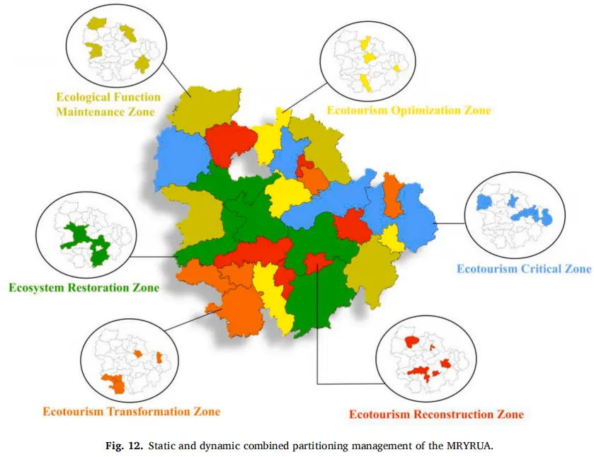 图12展示了MRYRUA的动静结合分区,将其划分为六个生态管理区,揭示了生态-旅游相互作用的复杂性。总体而言,14.3%的城市处于生态-旅游临界状态,17.9%的城市需要加强生态系统修复,21.4%的城市已进入生态-旅游重构阶段。具体而言:(1)生态-旅游临界区(I-US3)包括宜昌、武汉、九江、上饶,TD与ESV均较高,但生态退化明显;(2)生态功能维护区(II-US1)位于外围,包括襄阳、常德、黄冈、抚州,ESV高,旅游业发展相对较低,生态状况改善;(3)生态系统修复区(II-US1)集中在中心区域,包括荆州、岳阳、益阳、宜春、吉安,高ESV与低旅游业发展并存,同时存在生态退化;(4)生态-旅游优化区(III-S1)包括孝感、咸宁、鹰潭、株洲,特征是旅游业发展和ESV均较低,但生态状况改善;(5)生态-旅游转型区(III-US1)集聚在西南部,包括娄底、衡阳、湘潭、黄石、景德镇,特征是旅游业发展低、ESV低,并有轻微生态退化;(6)生态-旅游重构区(III-US2和IV-US2)分散在南部地区,以长沙、萍乡、新余、南昌、荆门为代表,过度的旅游开发已导致显著的生态退化。