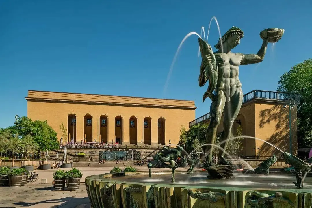 哥德堡的文化中心广场,周围环绕着艺术博物馆、音乐厅、市剧院和图书馆。广场中央是著名的海神波塞冬雕像喷泉,是市民和游客喜爱的聚会地点。