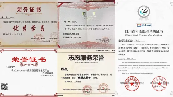 此外,她荣获2025年四川省高校就业创业指导金课建设活动“优秀志愿者”称号,获得“云梯筑梦,爱益无疆”市级公益证书。在学习科研方面,2024-2025学年,她的综合测评和学业成绩均位列年级第一,是该学年“校级特等奖学金”获得者,荣获2025年英语百万同题活动“优秀作品奖”,且有一项大学生科研项目为校级立项。在工作实践方面,她被评为2024—2025学年驿旅阳光辅导员工作室新媒运营部“优秀干事”。她还担任院级学生会心理实践部部长、就业课助理、班级文体委员。作为校级特等奖学金获得者,祝欣将不负努力,不负时光,以优秀为帆,赴更远山海。