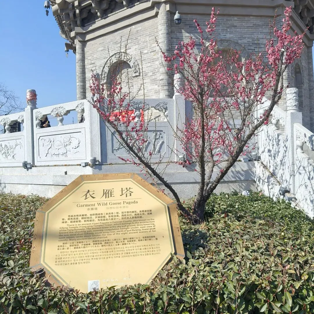 此塔名为“衣雁塔”,报春的梅花已然怒放。登塔需要付钱,为了不留遗憾,我们拾级而上。楼梯是折扇型的,折转而上。