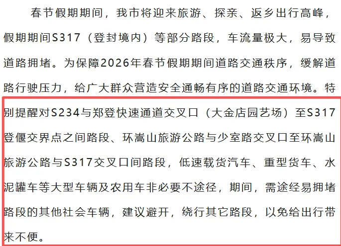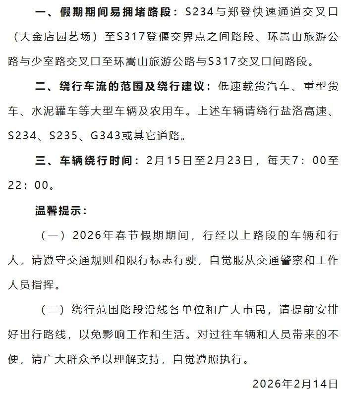 春节假期,登封各景区迎来客流车流高峰,为保障道路安全畅通,景区周边道路将适时实施交通管制。