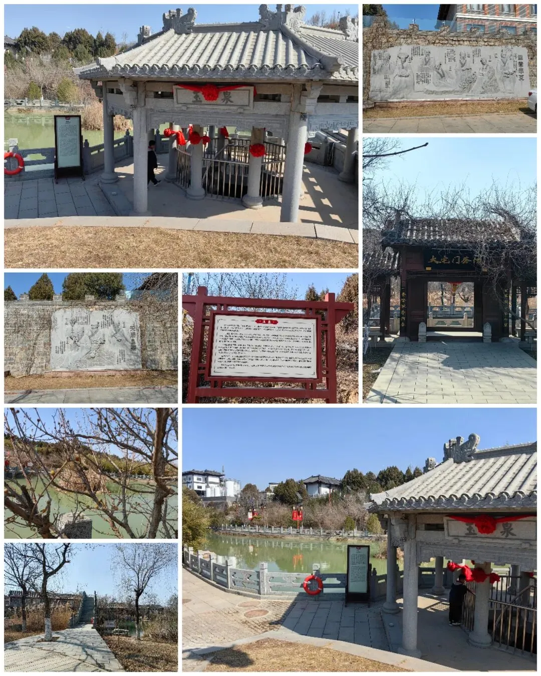 景区不大,但集自然、人文、产业于一体,安静、清幽、透着灵气。景区内宏济堂百草园依山顺势种植有牡丹、桃树和药材。山顶是玉泉阁,阁上有观象台、取火台。阁东西侧的山腰建有听风阁和观雨亭。东侧山脚有玉泉湖、玉泉井。景区内还有扁鹊纪念馆、宏济堂博物馆、乐镜宇纪念馆,可惜都没开馆,没能进入。景区东侧有胶坊,据说预约可参观熬制阿胶,也有针对青少年的研学,但是过年期间都没开展。胶坊往北,有长达四百多米的中医药文化浮雕墙,石刻浮雕,栩栩如生。景区内还有一处大宅门茶馆,据说《大宅门》中白景琦原型是宏济堂创始人乐镜宇。玉泉的泉水清冽甘软,符合陆羽“山水上”,大概是大宅门茶馆的文化根基。