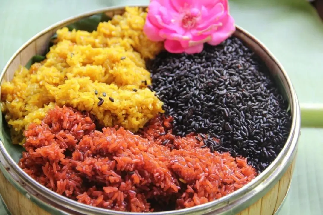 苗族传统美食,用红蓝藤、黄姜、三角枫的汁液将糯米染成红、黄、黑三色,清香可口,色彩斑斓,是长桌宴上的明星菜品,寓意吉祥。