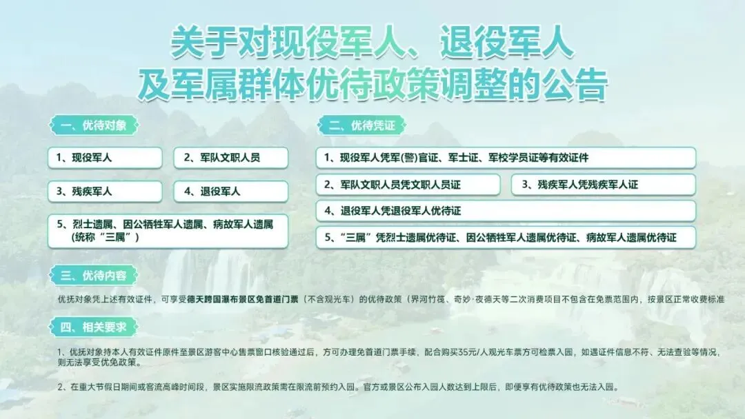 请前往景区的游客务必遵循“无预约,不前往”的入园提示,合理安排行程。未能预约到当日白天门票的游客,建议通过微信搜索官方购票平台【中旅趣边关】预订“奇妙·夜德天”夜场票(检票时间 17:30),也可到周边其他景区游玩,适当调整行程,错峰出行。为此给您带来不便敬请谅解,祝您旅途愉快。