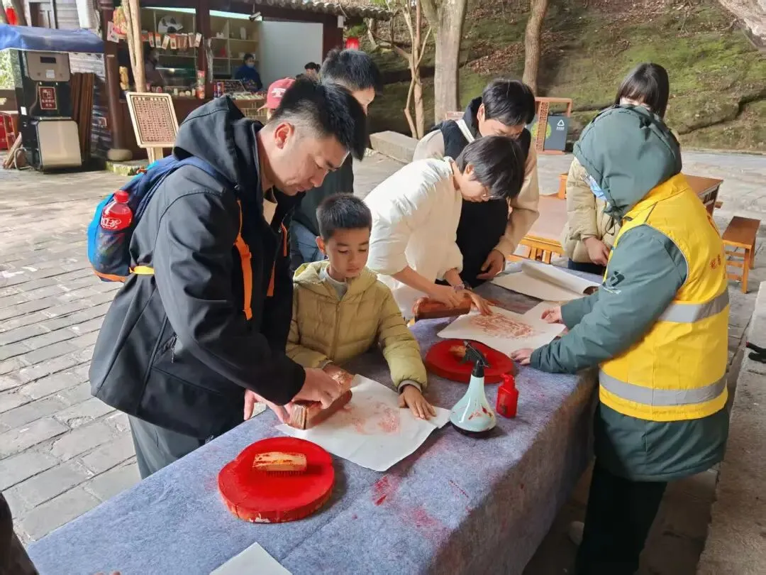 冠豸山上游第一观游客登高望远,体验四堡雕版印刷技艺