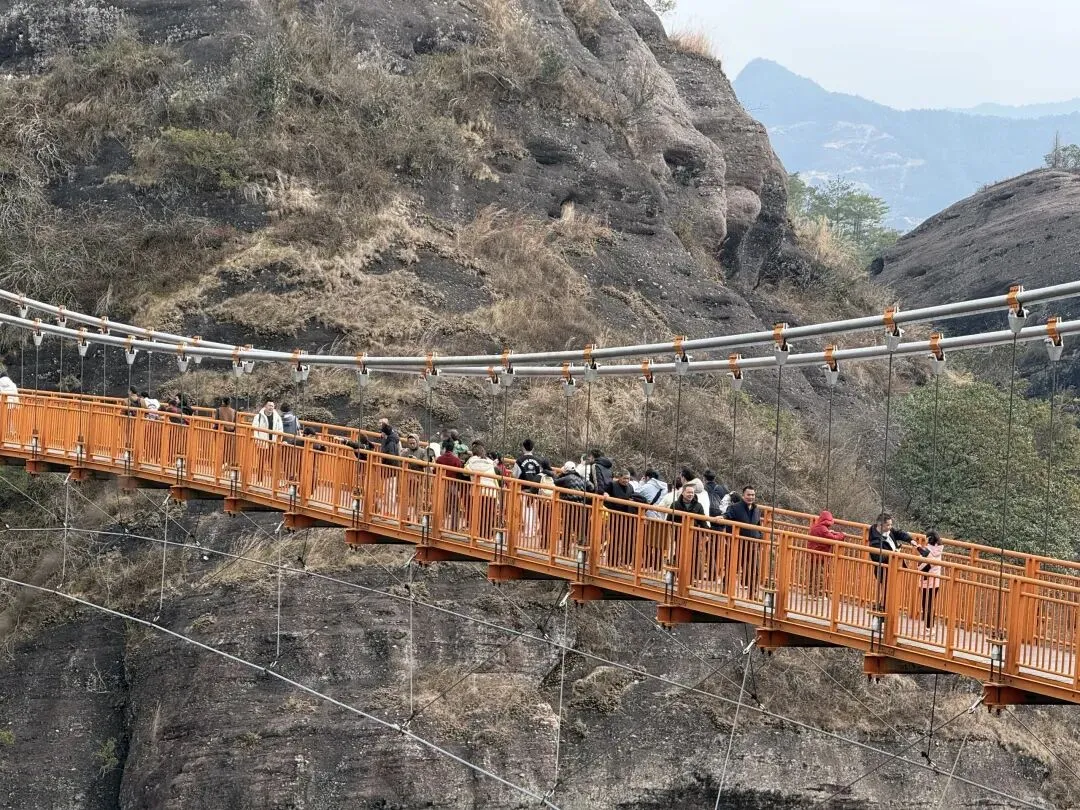 冠豸山网红索桥游客置身大山C位,感受春山怀抱