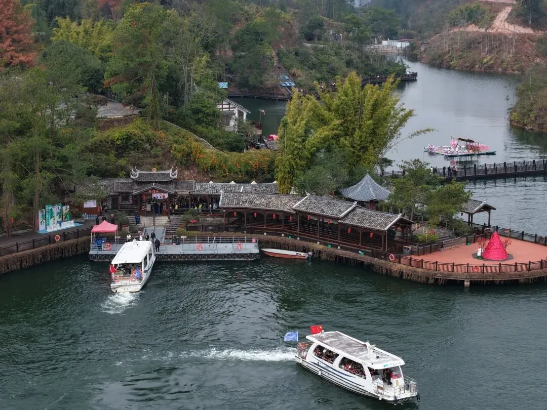 石门湖游客络绎不绝,乘船感受祖国美丽河山。