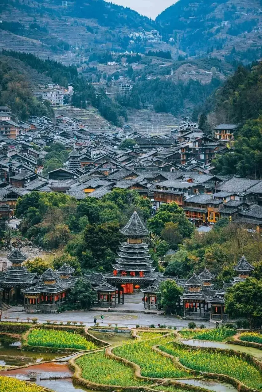 比西江千户苗寨安静.太多。五个.鼓楼.,代表五个家.族,晚上亮.起灯,倒映在.水塘.里。.随便找.一.家.楼边.的.粉店,十.块钱吃碗酸汤牛肉粉,看当地人.围着鼓.楼烤火聊天,听得懂.听不懂都舒服.。