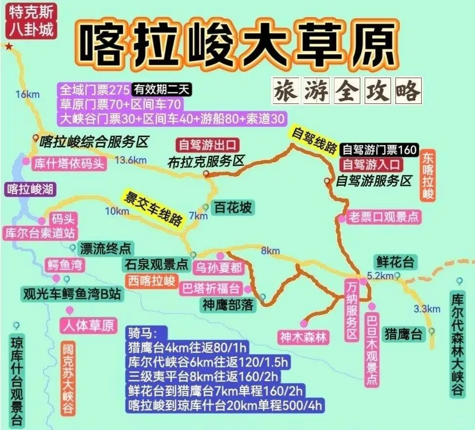 D1:.特克.斯县城 → .喀拉峻游客中心 → 游览.草原.景区.(鲜花台、猎鹰台)