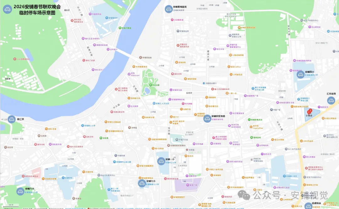 安铺特色展馆、安铺一小、安铺四小、安铺七小、安铺八小、安铺九小、新区农贸市场西侧停车场、汇华宾馆停车场、安铺游泳池、印象主题公园、星海丽湾广场、河边街畔江亭停车场、污水处理厂(文阁塔公园对面)门前周围、九洲江运通饭店停车场。