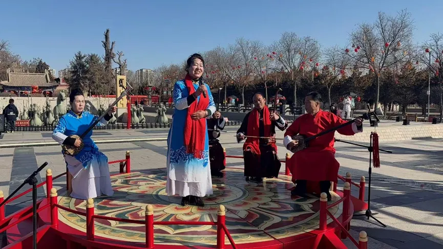 各大景区内,凉州攻鼓子的舞者们身着黑衣白扣的“武士装束”,阵形由小到大,鼓点由慢到快,展现出凉州文化的豪迈与苍凉。而民勤曲子戏、凉州半台戏等戏曲类非遗代表性项目,非遗传承人精选《闹书馆》《张良卖布》《小放牛》等群众喜闻乐见的经典曲目,现场锣鼓铿锵、唱腔悠扬,在一唱一念、一颦一笑间感受非遗魅力,引得大量游客驻足观看,互动拍照。