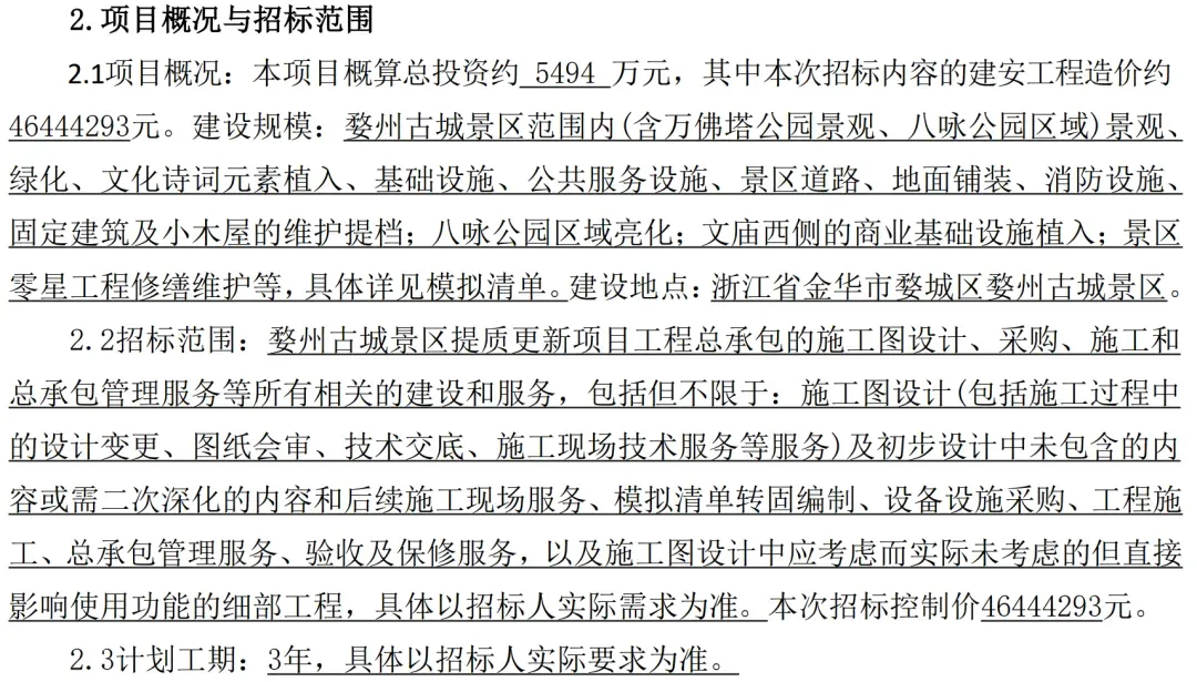 项目概况:本项目概算总投资约5494万元,其中本次招标内容的建安工程造价约46444293元。建设规模:婺州古城景区范围内(含万佛塔公园景观、八咏公园区域)景观、绿化、文化诗词元素植入、基础设施、公共服务设施、景区道路、地面铺装、消防设施、固定建筑及小木屋的维护提档;八咏公园区域亮化;文庙西侧的商业基础设施植入;景区零星工程修缮维护等,具体详见模拟清单。