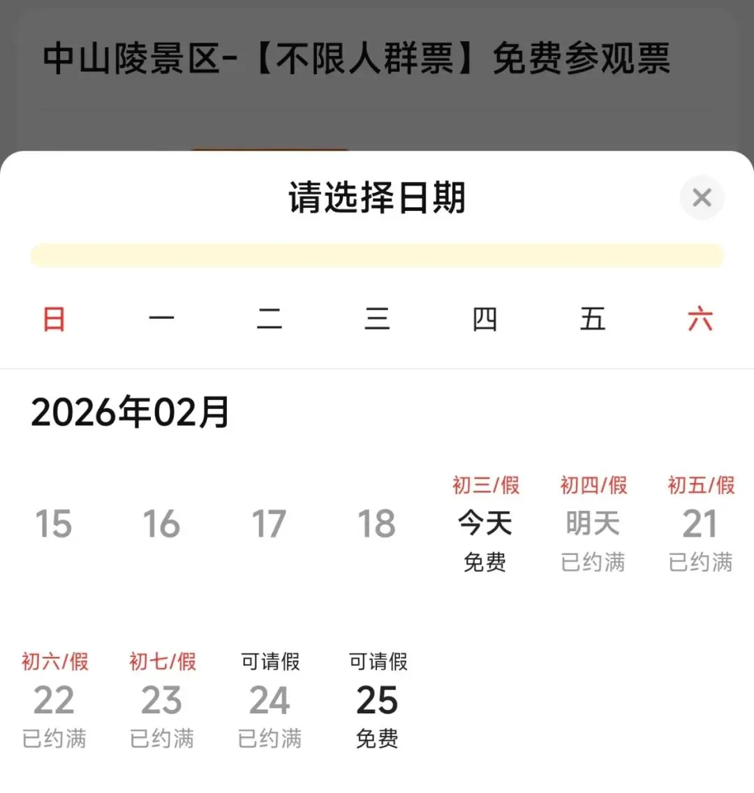 南京中山陵景区2月19日上午还可预约,2月19日下午时段至2月24日均已约满。