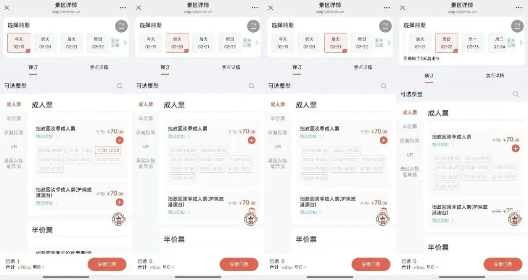苏州拙政园仅2月19日11:30至12:30时段有少量余票,未来几天门票已售罄。