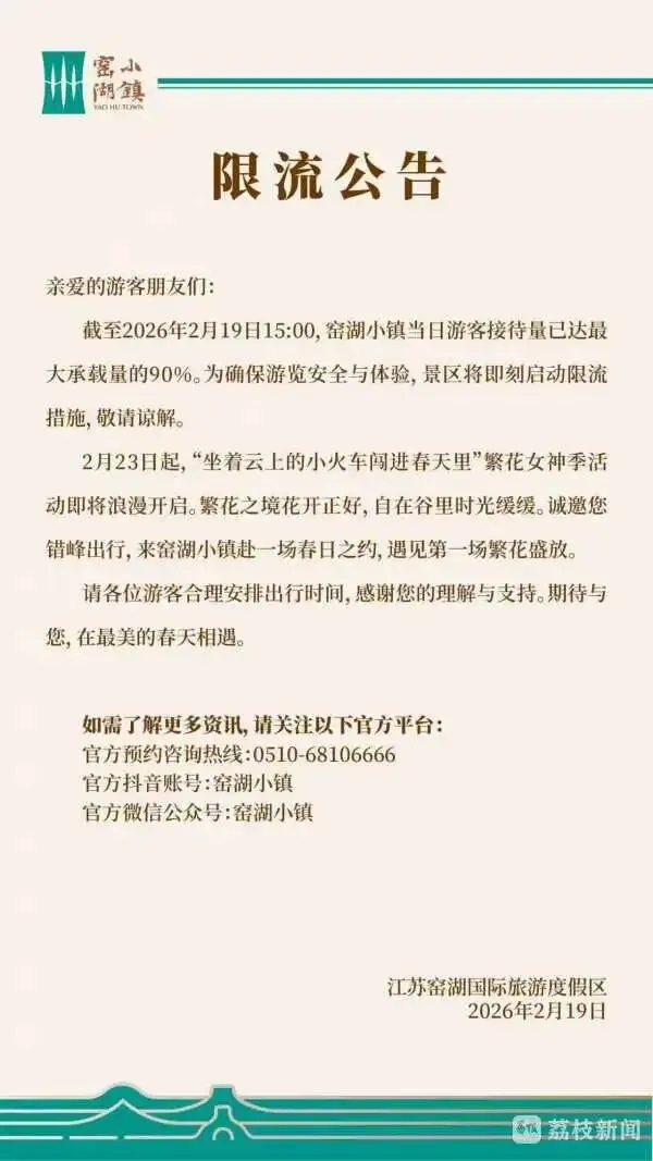 截至2月19日15:00,无锡窑湖小镇当日游客接待量已达最大承载量的90%。为确保游览安全与体验,景区即刻启动限流措施。