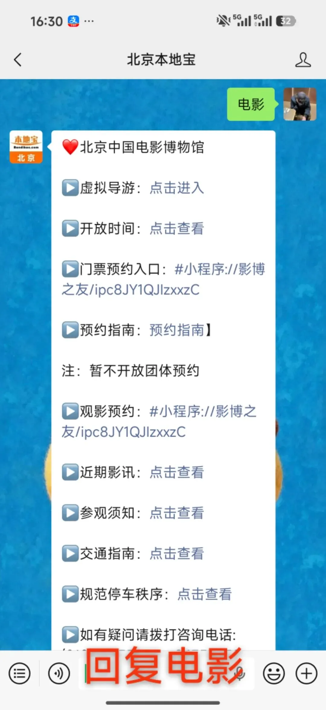 预约入口:扫描下方二维码,关注【北京本地宝】微信公众号,在对话框回复【电影】即可获取中国电影博物馆预约入口