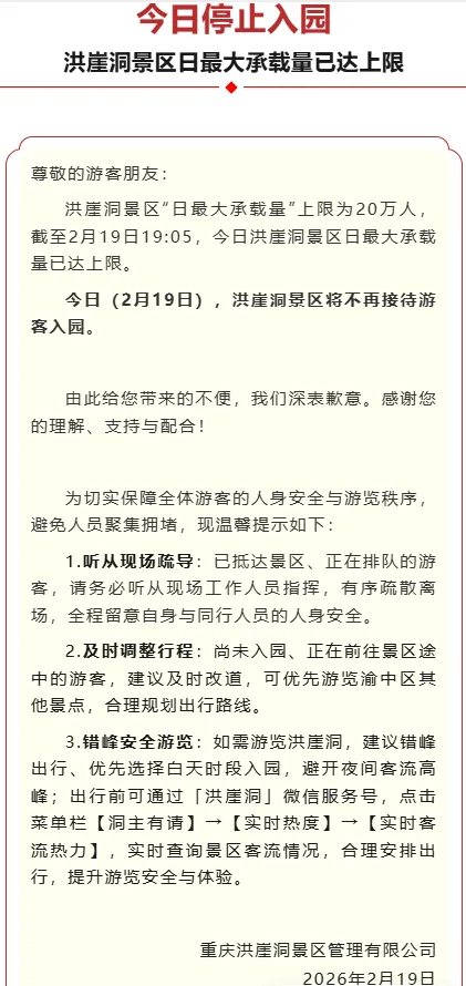 重庆一景区紧急提醒:停止入园2月19日晚,重庆洪崖洞景区发布通知,截至19:05,洪崖洞景区日最大承载量已达上限,今日将不再接待游客入园。
