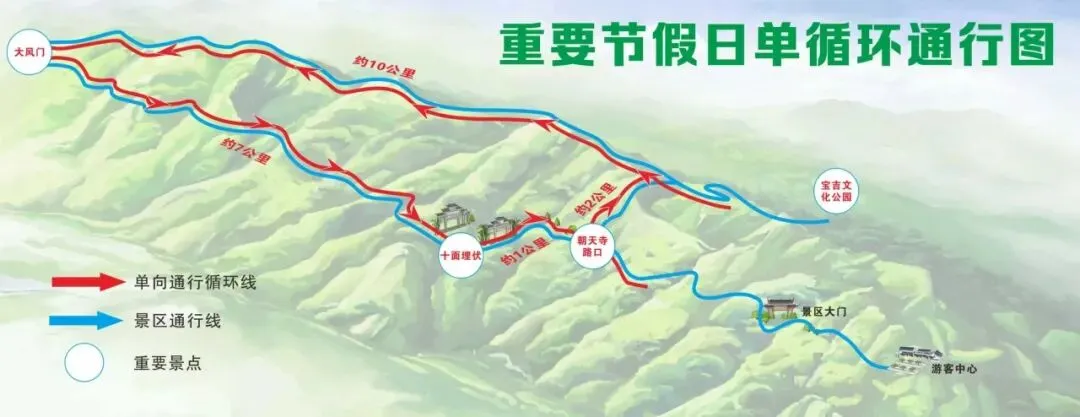 1.一级管控(在景区人数达4000人时):佛宝路(十面埋伏至宝吉文化公园路段)实行单向通行(仅限十面埋伏往宝吉文化公园方向)。从宝吉文化公园至十面埋伏的车辆,请统一从大风门绕行。通行时请遵从现场安保人员引导,沿途禁止停车或调头。