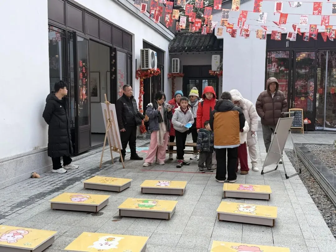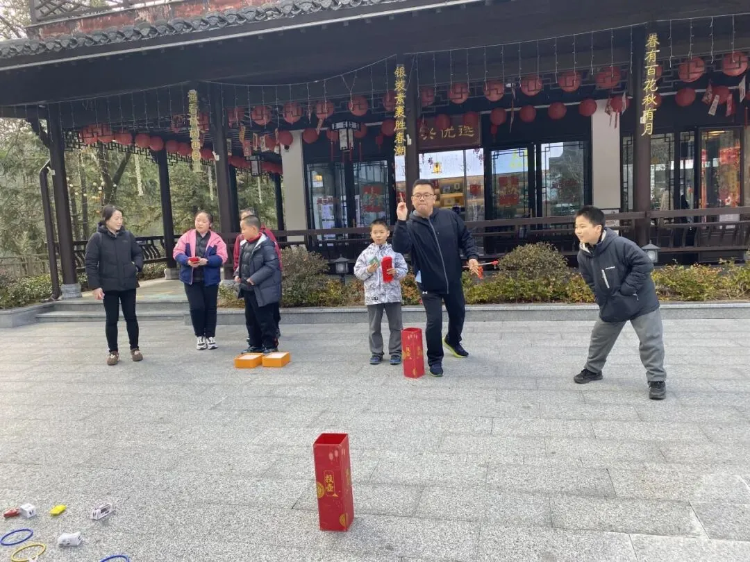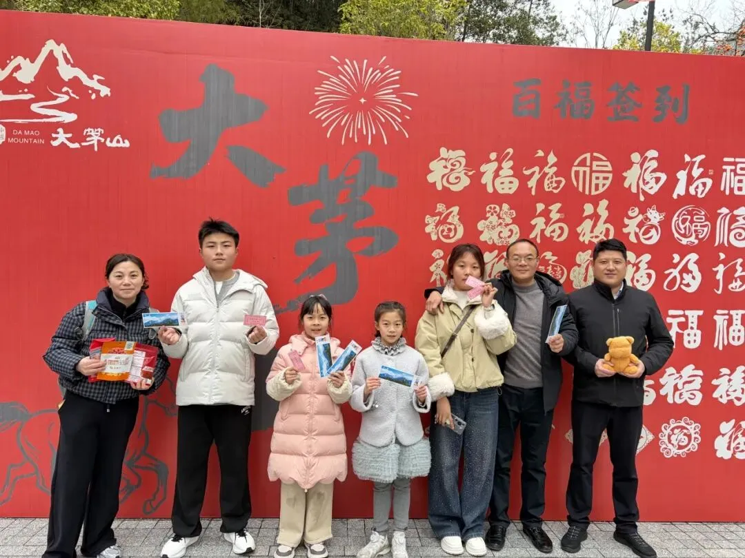 大茅山旅游度假区的众多活动,也吸引了超多游客携家人前来游玩,围在一起参与投壶游戏,抬手投箭间,藏着传统民俗的乐趣与新春的欢喜,白墙黛瓦的街巷间,祈福彩幅迎风招展,大人小孩驻足参与趣味互动。在满墙福字的映衬下笑意盈盈,将新春的福气与旅途的快乐一同珍藏。