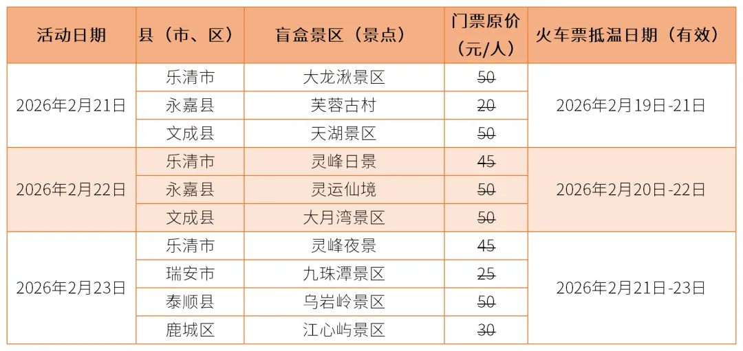 春风有信,温暖有约。一张火车票,既是奔赴温州的通行证,也是解锁免费美景的钥匙。快@你的旅游搭子,坐上火车来温州,拆景区盲盒,享山海温情,让这场旅行既有仪式感,又满是暖意!