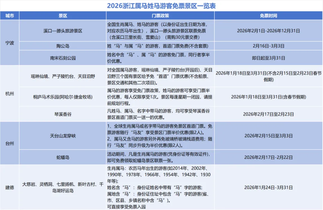 即日起至2026年3月3日,属马、姓马游客凭身份证,可享上述26家景区门票6折及以下优惠。