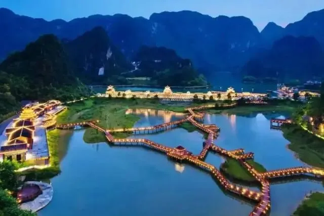 夜幕降临后灯光璀璨犹如坠入湖中的繁星