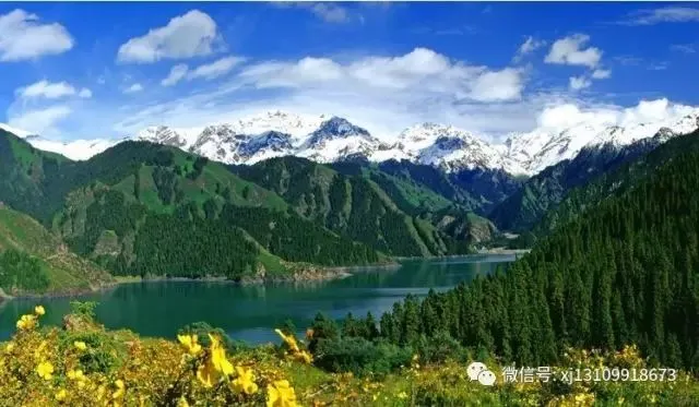 天山天池风景名胜区,位于新疆维吾尔自治区昌吉回族自治州阜康市境内,距乌鲁木齐约110公里,是古代冰川泥石流堵塞河道形成的高山湖泊,位于新疆天山东段最高峰博格达峰的山腰,海拔1980米,湖面呈半月形,面积约4.9平方千米,是世界著名的高山湖泊。