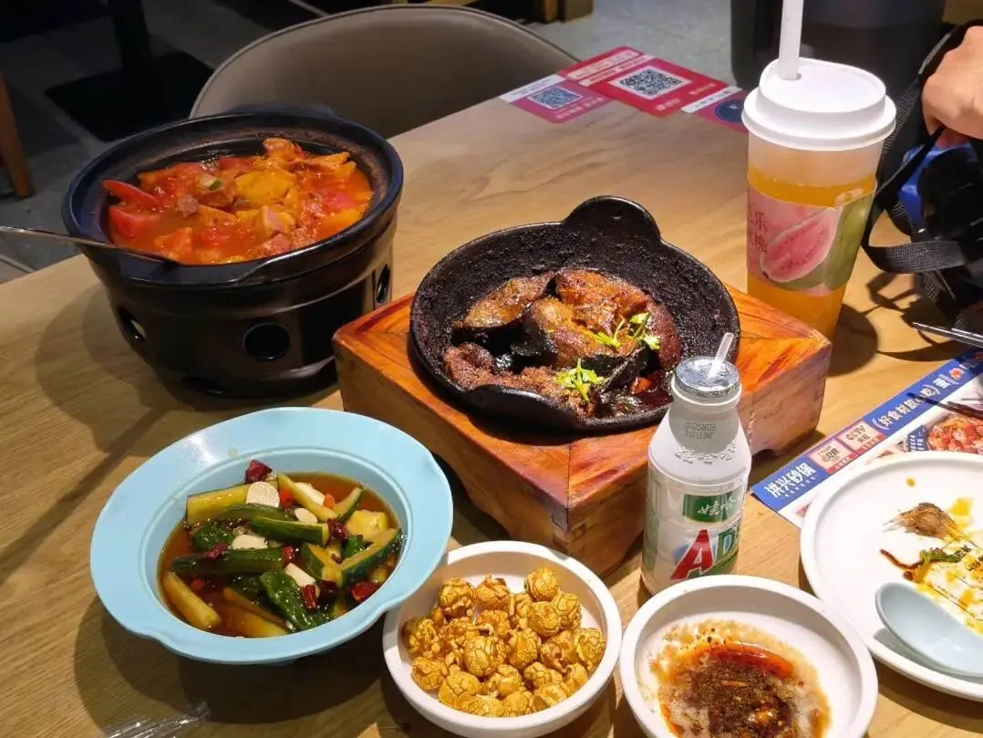 我们点了招牌鲶鱼砂锅、番茄牛腩砂锅、凉拌黄瓜,店里生意很兴隆,味道确实没得说!鲶鱼肉很肥美,很大一块儿,鱼皮煎的焦香,很对某人胃口,对鱼有点过敏的我也忍不住尝了两三块儿。番茄牛腩一如既往地下饭,凉拌黄瓜特意让老板多加了点醋,清爽解渴。店里还有小吃 爆米花,主食还可以选择白馒头。想喝小甜水啦,还在商场买了一杯当地的阿水大杯茶芭乐桃桃,甜度有点超标。两人吃美啦就开始晕碳了,想着烈日炎炎,就回酒店小憩了一会。