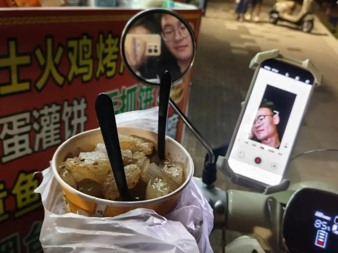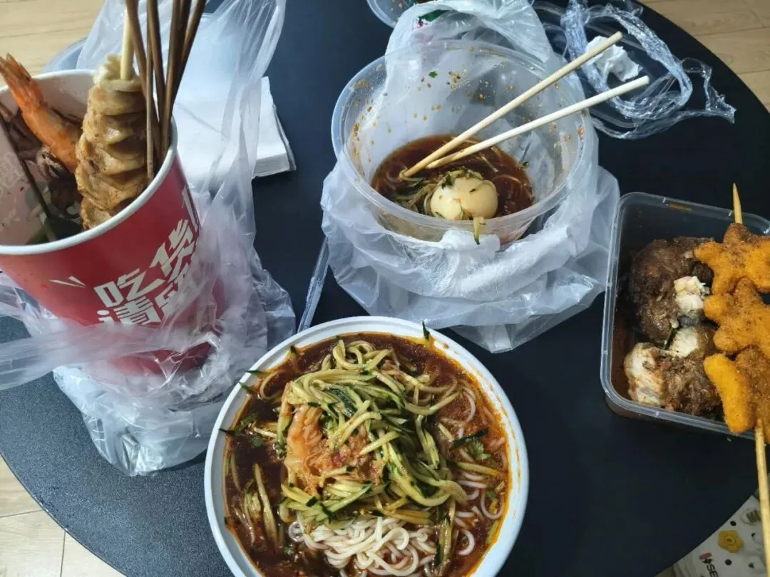 后面骑车原路返回,又看了一次宁静的大海。回去在烟大小吃街买了晚餐,此小吃街不同于财大小吃街,是在室内固定摊位,就像商场🏬一样,好处是不管天晴下雨都能按时出摊👍🏻 买了一大碗朝鲜冷面、看到旁边有两家烧烤摊,我们随便找了一家,买了点串串🍢 但是卫生条件肉眼可见般差…我们亲眼看到店员把擦过脏柜台的毛巾又去擦装串的托盘😢😰蒜鸟蒜鸟!买完我们回酒店看JOJO啦 夜深睡觉💤