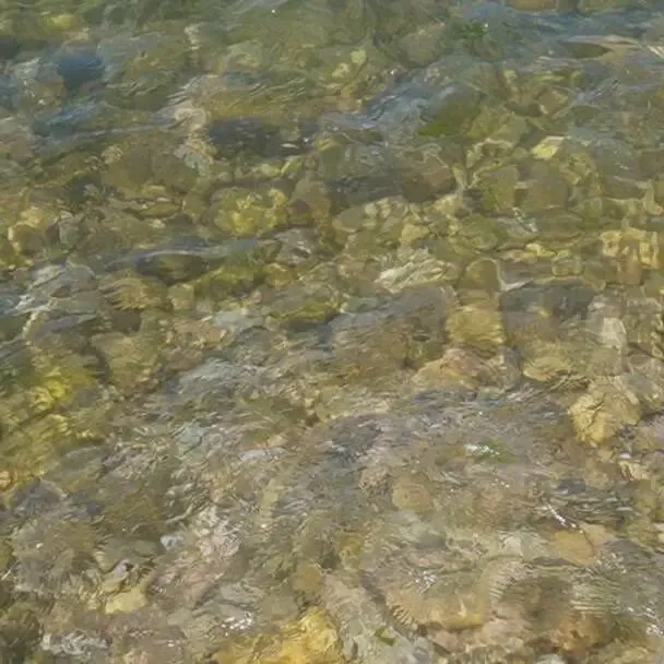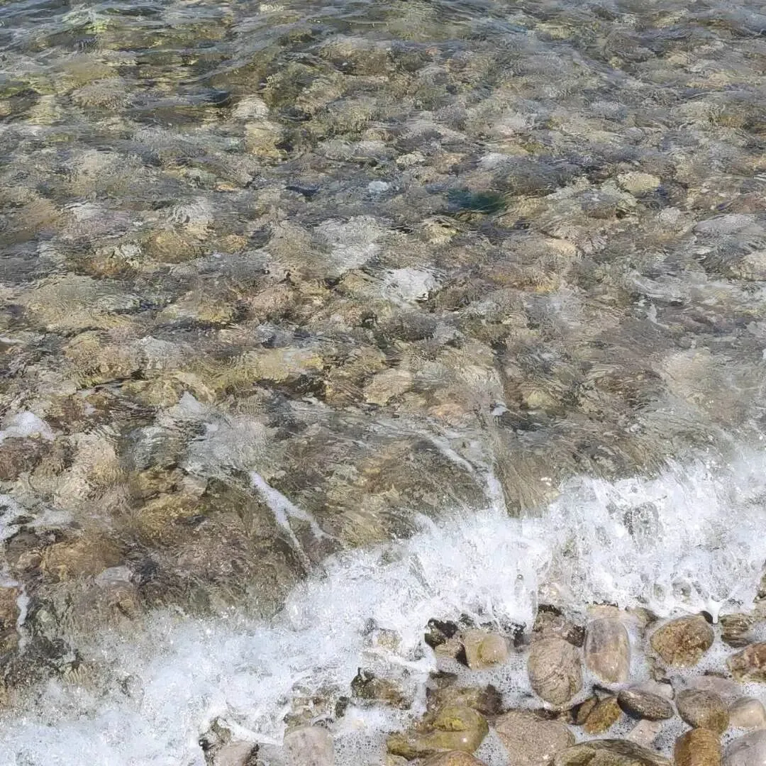 后面我们从公路往下走了一个坡道,就看到大海啦。这也是一片铺满鹅卵石的果冻海,真的清澈见底,太阳照着海面波光粼粼的。