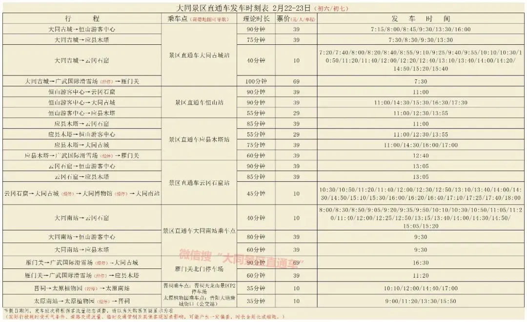 大同景区直通车最新时刻表!