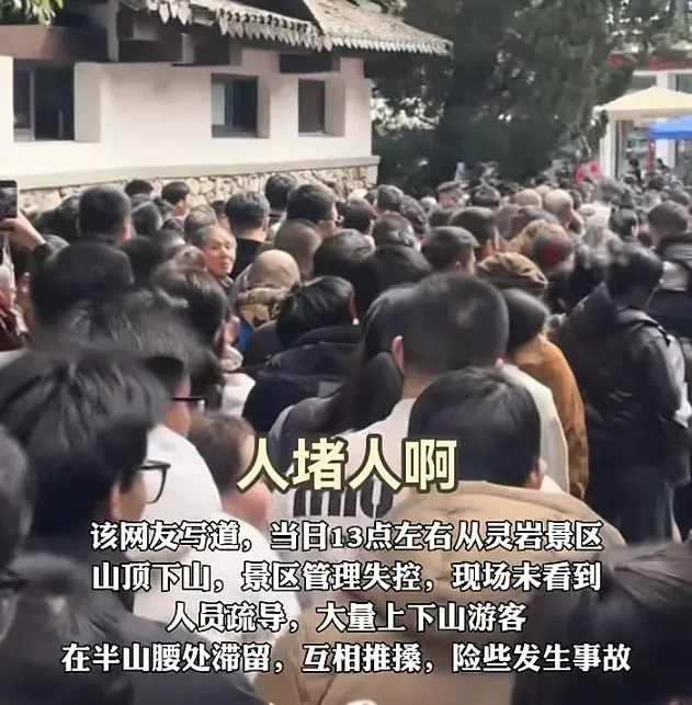 2月19日,景区的工作人员回应,网传部分路段存在游客滞留、通行缓慢情况属实。“灵岩、方洞等片区游览路线为环形设计,在客流高峰时易出现通行不畅问题。”工作人员表示,已根据客流情况启动限流机制。此外,景区已安排大量工作人员在现场协调,进行秩序维护,全力保障游览安全与通行效率。
