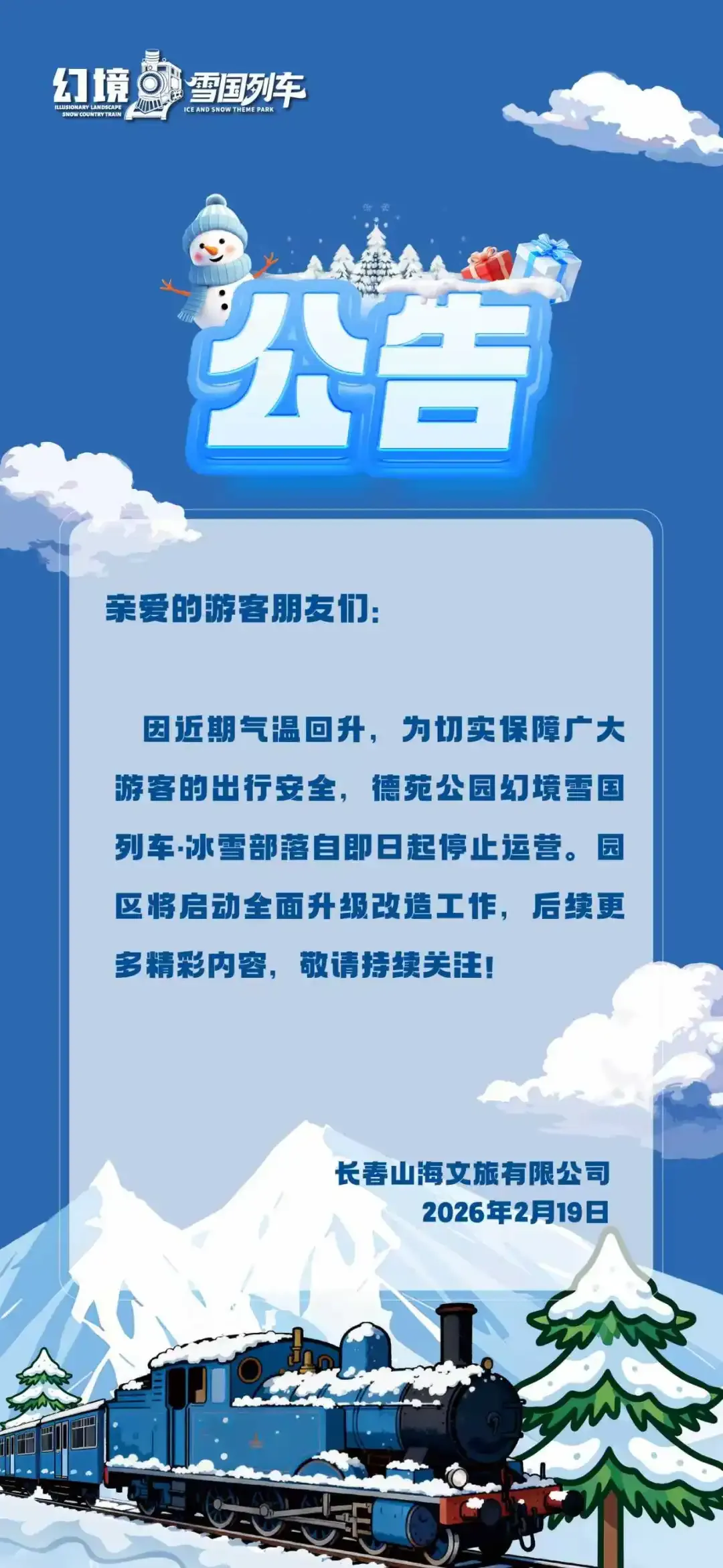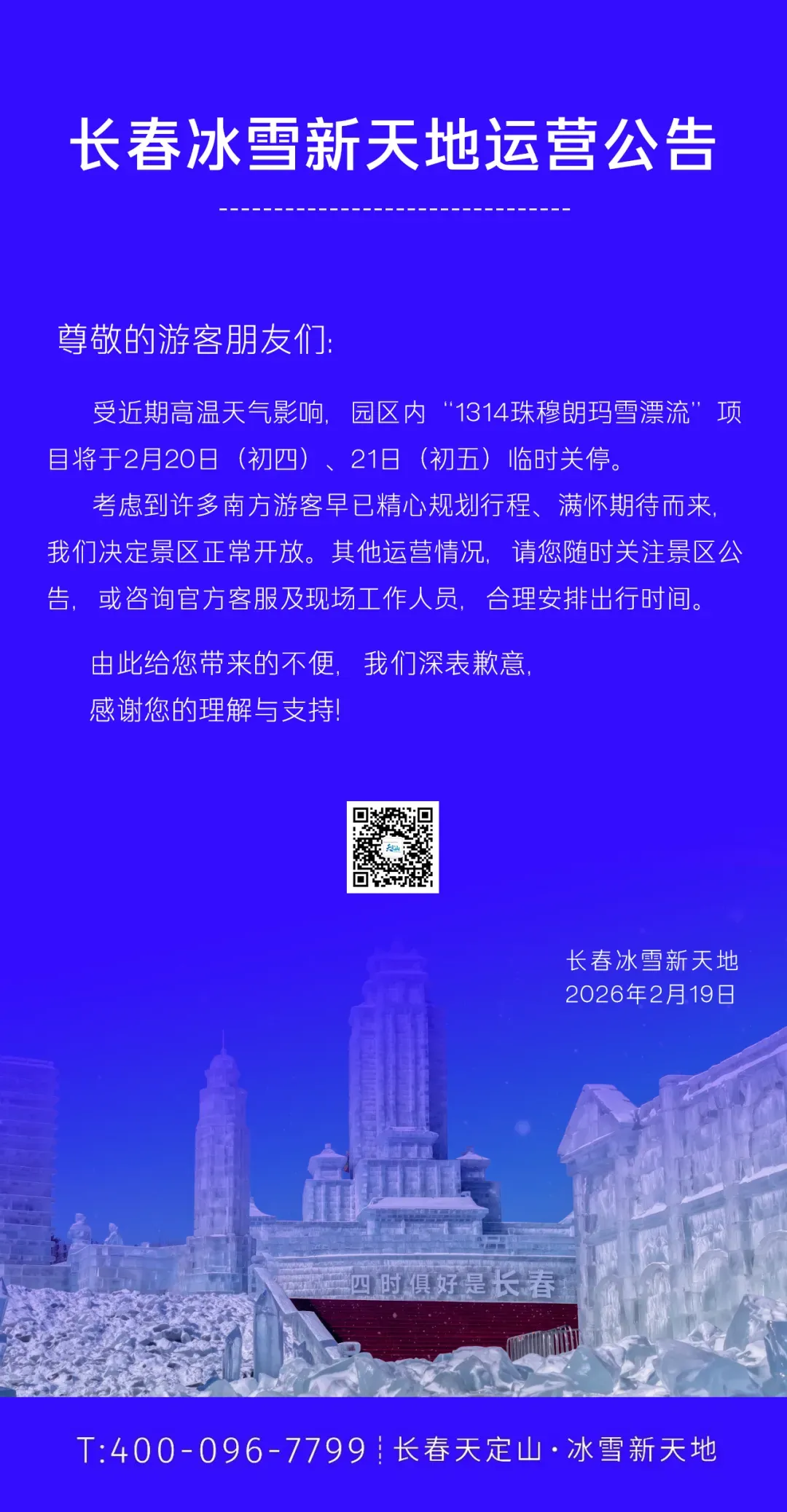 长春冰雪新天地运营公告: