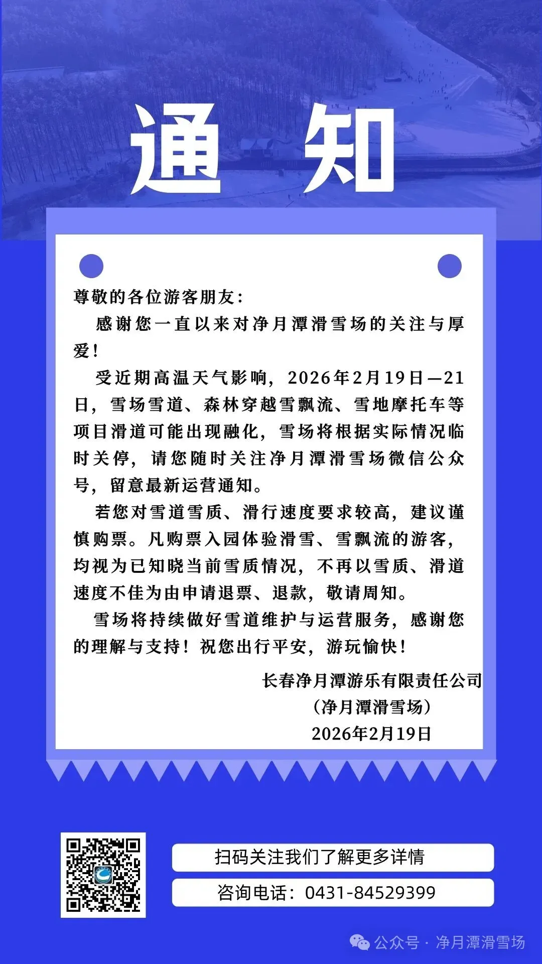2月19日,净月潭滑雪场最新通知:受近期高温天气影响,2026年2月19日一21日,雪场雪道、森林穿越雪飘流、雪地摩托车等项目滑道可能出现融化,雪场将根据实际情况临时关停——