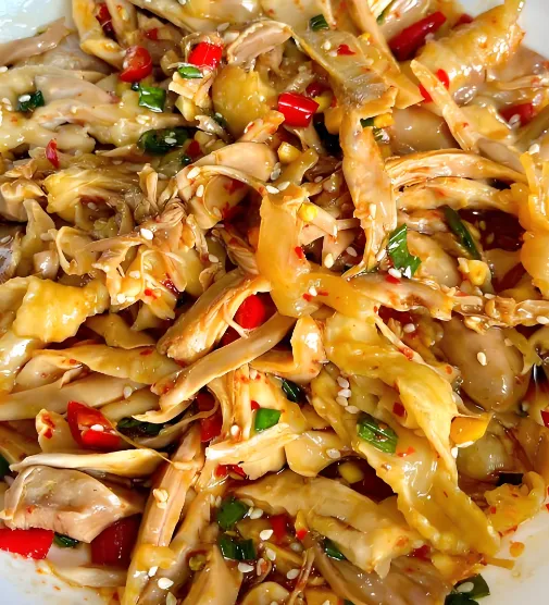 第四美食:鬼鸡——景颇族的酸辣狂欢这道菜看着黑黢黢的,其实是手撕鸡肉拌上柠檬汁、小米辣、大芫荽,酸辣开胃,肉质鲜嫩。特别是夏天吃,爽到飞起。很多傣味餐厅都有,比如“勐卯宴”,做得很地道。人均60元左右。