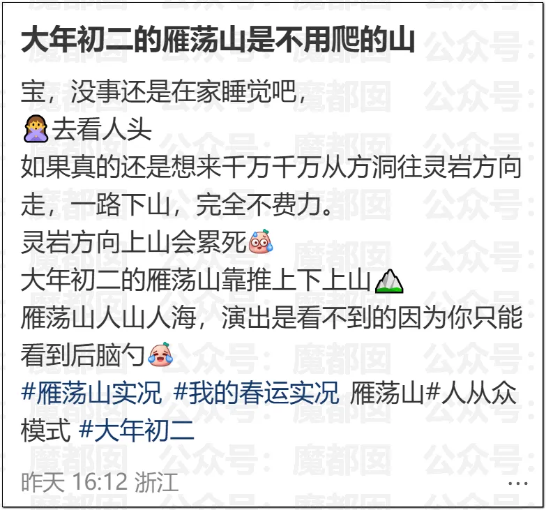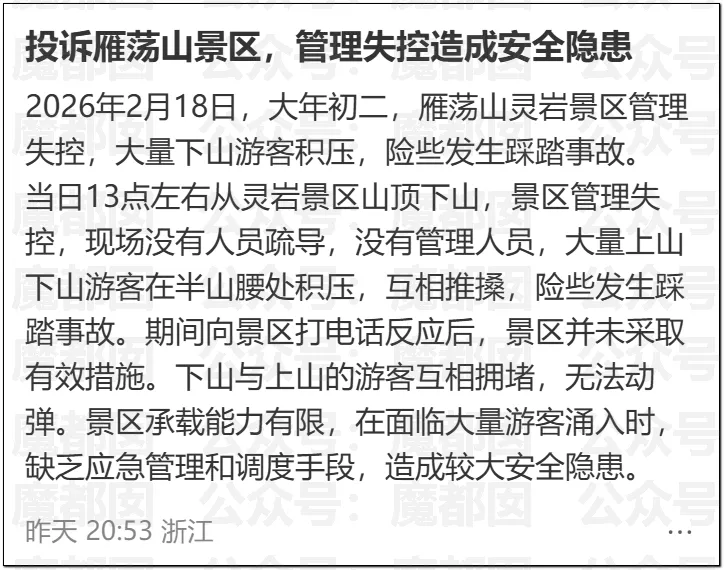 我们知道是不是这个原因,这个出游热情陡然上升,我们不写也不行了。 第一个要写的大家猜猜是哪里?呵呵呵,雁荡山,这几天我们陆续接到无数网友吐槽,这个雁荡山的dang是上当的“当”…… 这个现场已经不能用夸张来形容了: